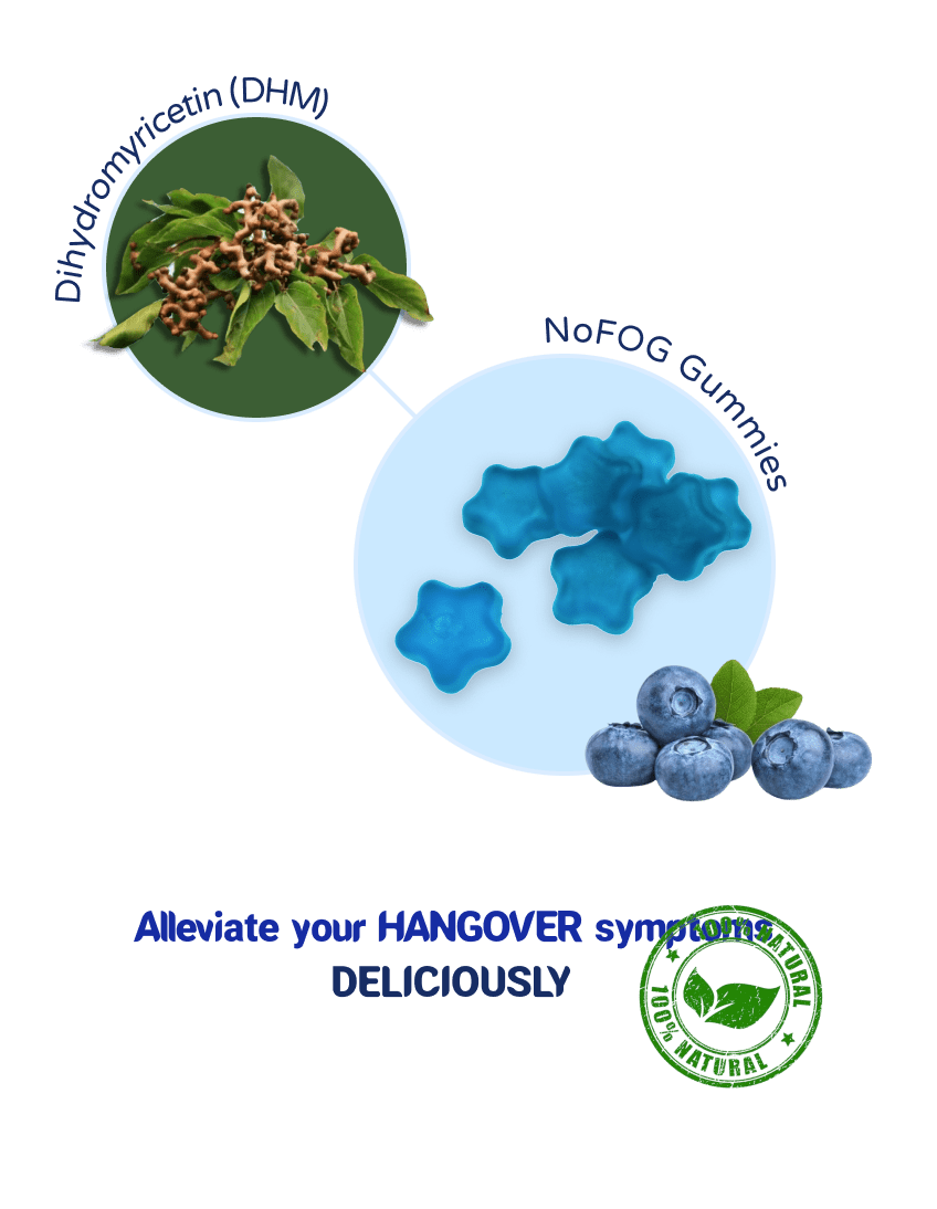 NoFOG gummies (DHM) boost ALDH efficiency, breaking down toxic acetaldehyde faster.